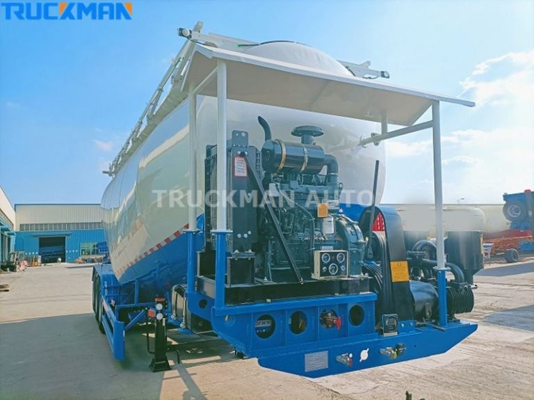 Los remolques cisterna para cemento utilizan la potencia de un motor autopropulsado para impulsar el compresor de aire de a bordo a través del extractor. Esta configuración envía aire comprimido a través de la tubería a la cámara de aire situada en la parte inferior del tanque sellado.